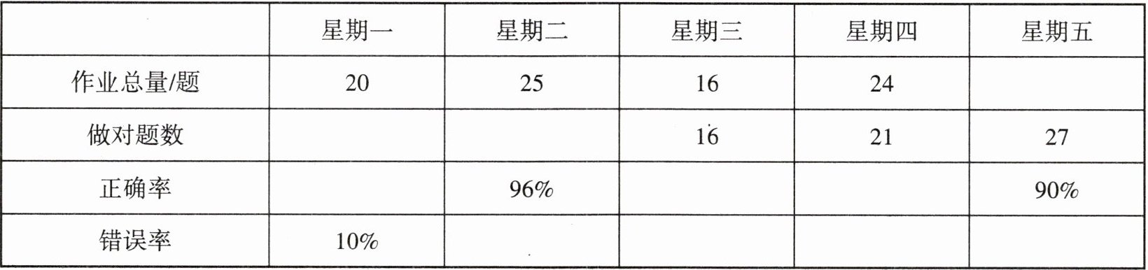 对于星期五,已知做对题数为27题,正确率为$90\%$,那么作业总量为$\frac{27}{90\%}=30$(题),错误率为$10\%$。
