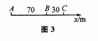 出发点A的位置:由于$AC=100m$,$BC=30m$,则$AB=AC-BC=100-30=70m$,但A在B的西边,所以A的位置坐标为$-70m$。