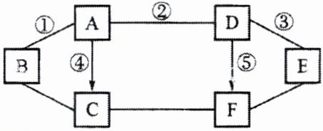 7.(十堰中考)如图,A、B、C、D、E、F是初中化学常见的物质,且A、B、C、D、E是五种不同类别的物质,已知B是世界上产量最高的金属,图中“—”表示相连的物质之间可以在溶液中发生化学反应,“→”表示某种物质可以转化为另一种物质(部分反应物、生成物及反应条件已略去,所涉及的化学反应均为初中化学学习中常见的反应)。