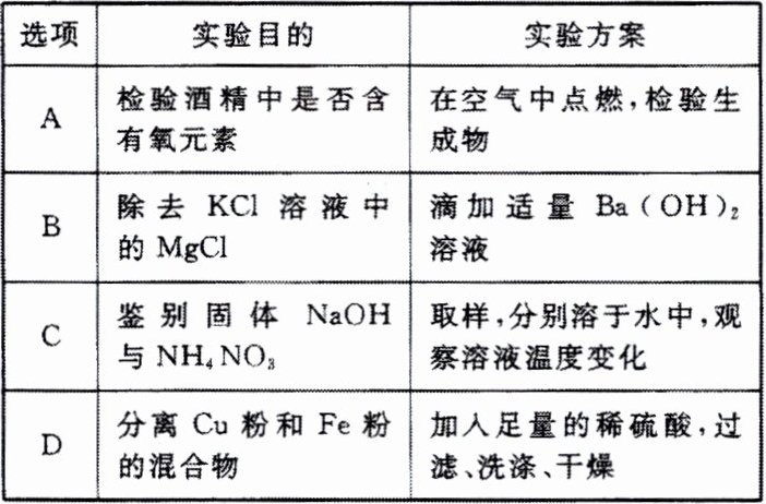 |A|检验酒精中是否含有氧元素|在空气中点燃,检验生成物|