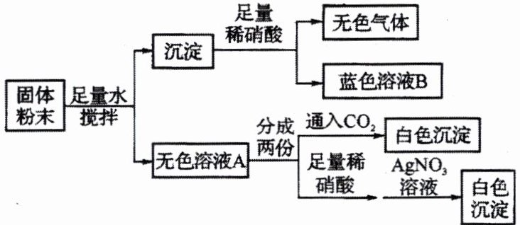 5. (无锡中考)一包固体粉末可能含有${NaNO3}$、${CaCO3}$、${NaOH}$、${CuCl2}$、${NaCl}和{Ca(NO3)2}$中的一种或几种,为确定其组成,某同学设计了如下实验方案。下列判断正确的是 ( )