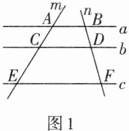 1. 如图1,已知直线$a// b// c$,直线$m,n与直线a,b,c分别交于点A,C,E,B,D,F$,$AC= 4$,$CE= 6$,$BD= 3$,则$BF= (\quad)$