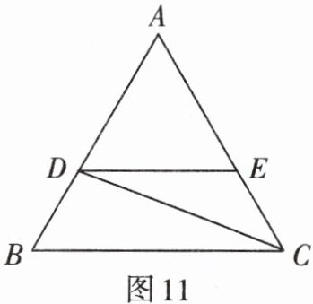 3. 如图11,$\triangle ABC$是边长为2的等边三角形,$DE// BC$,$\triangle BCD的面积是\triangle ABC面积的\frac{1}{4}$.求$EC$的长.