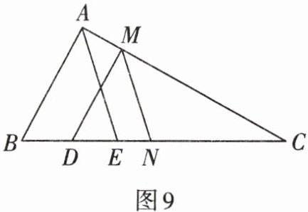1. 如图9,在$\triangle ABC$中,$MD// AB$,$MN// AE$.求证:$\frac{CD}{CB}= \frac{CN}{CE}$.