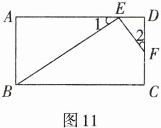 4. 如图11,在矩形$ABCD$中,点$E$,$F分别在边AD$,$DC$上,$\triangle ABE \backsim \triangle DEF$,且$\angle 1= \angle 2$,$AB= 6$,$AE= 9$,$DE= 2$,求$EF$的长.