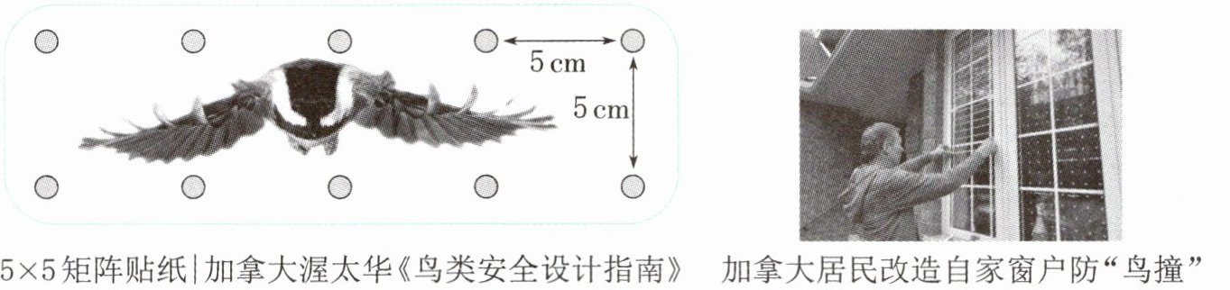 [材料三]阻止“鸟撞”,我们能做什么?鸟类无法认识到,透明的玻璃是无法穿越的阻碍。因此,想要避免鸟撞玻璃的悲剧,最核心的办法是让鸟类“看见”玻璃的存在。美国鸟类保护协会的科学家们对不同类型的玻璃和花纹进行了检验。他们从约7米长的通道一侧释放小鸟,在通道另一侧放置了不同玻璃供小鸟选择。结果发现,只要给玻璃加上间距5×5厘米、直径1厘米的圆点矩阵,或是间距10厘米的垂直线,就能有效防止“鸟撞”。而且,相比水平方向的花纹,垂直的图案能够起到更好的视觉提示效果。