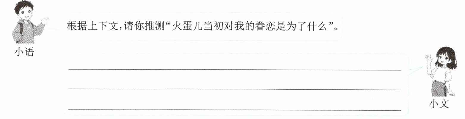 (4)悔恨心痛(每空1分) 12. 示例一:运用比喻的修辞手法,(1分)将进屋后的火蛋儿比作“一汪水”,形象地描绘出火蛋儿由紧张、兴奋的状态转变为放松、平静的状态,使读者能够直观地感受到火蛋儿进入人类居所后的安心与舒适。(1分)还体现了作者对火蛋儿的喜爱和怜悯之情,通过细腻的笔触将火蛋儿的可爱和作者的善意展现得淋漓尽致。(1分) 示例二:运用对比的写作手法,通过“一团火”与“一汪水”的对比,强调了火蛋儿在不同环境下的状态变化。(1分)突出了火蛋儿性格的活泼与温顺,也暗示了人类居所对于野生动物来说是一个充满安全和舒适感的避风港。(1分)还体现了作者对火蛋儿的喜爱和怜悯之情,通过细腻的笔触将火蛋儿的可爱和作者的善意展现得淋漓尽致。(1分) 13. “我”遇到火蛋儿时,它正在水中躲避金雕的追逐。火蛋儿被“我”所救,因祸得福,谋得暂时的安全。它从小心翼翼到最后失去警觉,在“我”家对面山坡被老鹰撕碎。(1分)由此可见,它躲进草垛、挠门进屋,眷恋背后是为了躲避那无时不在的威胁。(1分)它眷恋着“我”和妻子对它的善意,“我们”之间有超越物种的情谊。(1分) 14. 不矛盾。(1分)“火蛋儿成了我们生命中挥之不去的悔与痛”表达了作者对火蛋儿深深的内疚。“我们”以自己的好恶来收留与放弃火蛋儿,最终火蛋儿在野外遭遇了不幸,这是“我们”满怀善意地实施了逆天行道。(1分)而“万物生灵,各行其道”揭示了自然界中万物各自遵循着规律,每一种生物都有其独特的生存空间和生存方式,因此人类不能随意干涉和改变。(1分)两者是一致的,作者深刻反思了人类与野生动物之间的关系,我们既应该对野生动物怀有善意,又不能违背其生存之道。(1分)