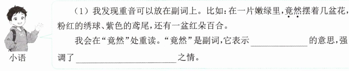 我会在“竟然”处重读。“竟然”是副词,它表示______的意思,强调了______之情。