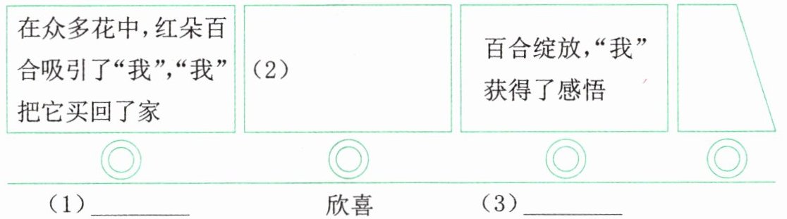 7. (核心素养·思维能力)小语对“我”买下红朵百合后的情感经历进行了梳理,请你与他一起完成下面的思维导图。(3分)