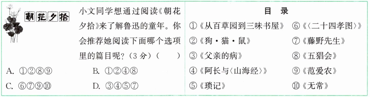 小文同学想通过阅读《朝花夕拾》来了解鲁迅的童年。你会推荐她阅读下面哪个选项里的篇目呢?(3 分)( )