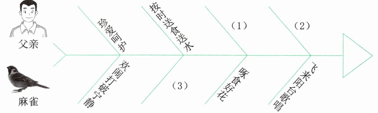 7. (核心素养·思维能力)文中着重记叙了父亲与麻雀之间发生的故事,请你梳理情节,补全鱼骨图。(3 分)