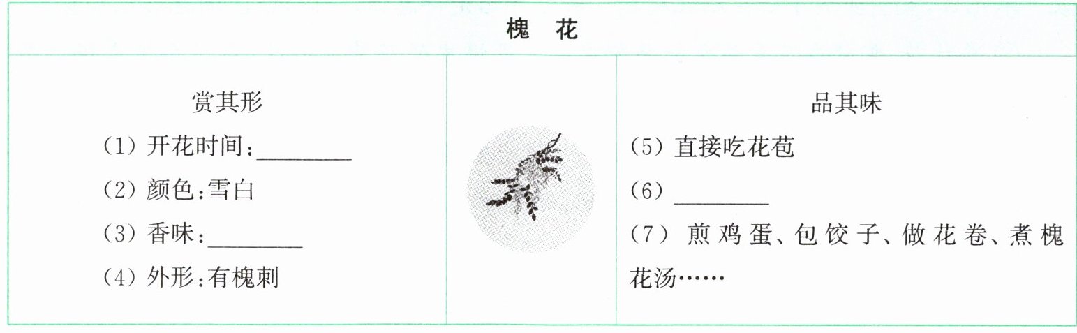 | 赏其形(1)开花时间:______(2)颜色:雪白(3)香味:______(4)外形:有槐刺 | 品其味(5)直接吃花苞(6)______(7)煎鸡蛋、包饺子、做花卷、煮槐花汤…… |