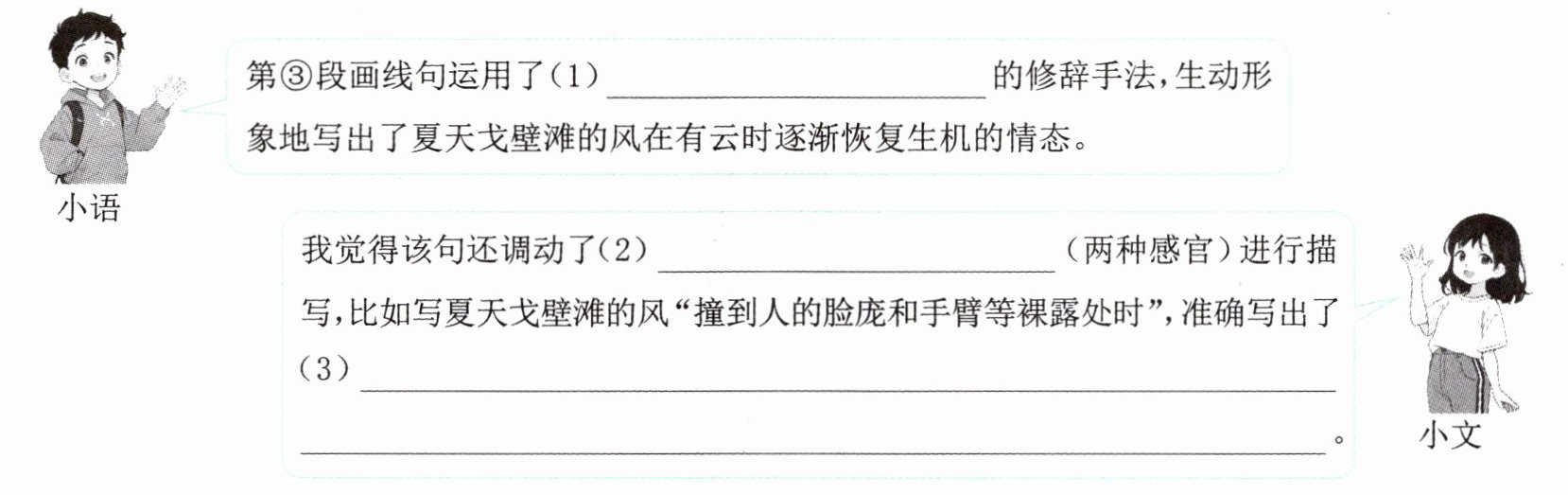 小语:第③段画线句运用了(1)______的修辞手法,生动形象地写出了夏天戈壁滩的风在有云时逐渐恢复生机的情态。