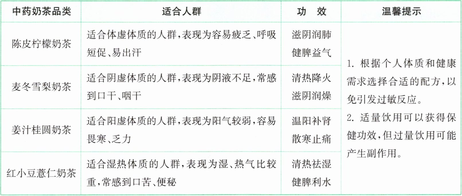 | 中药奶茶品类 | 适合人群 | 功效 | 温馨提示 |