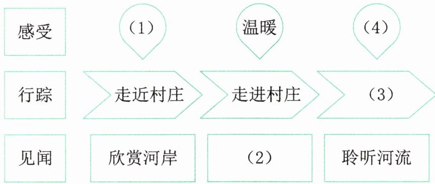 见闻:欣赏河岸 → (2)______ → 聆听河流