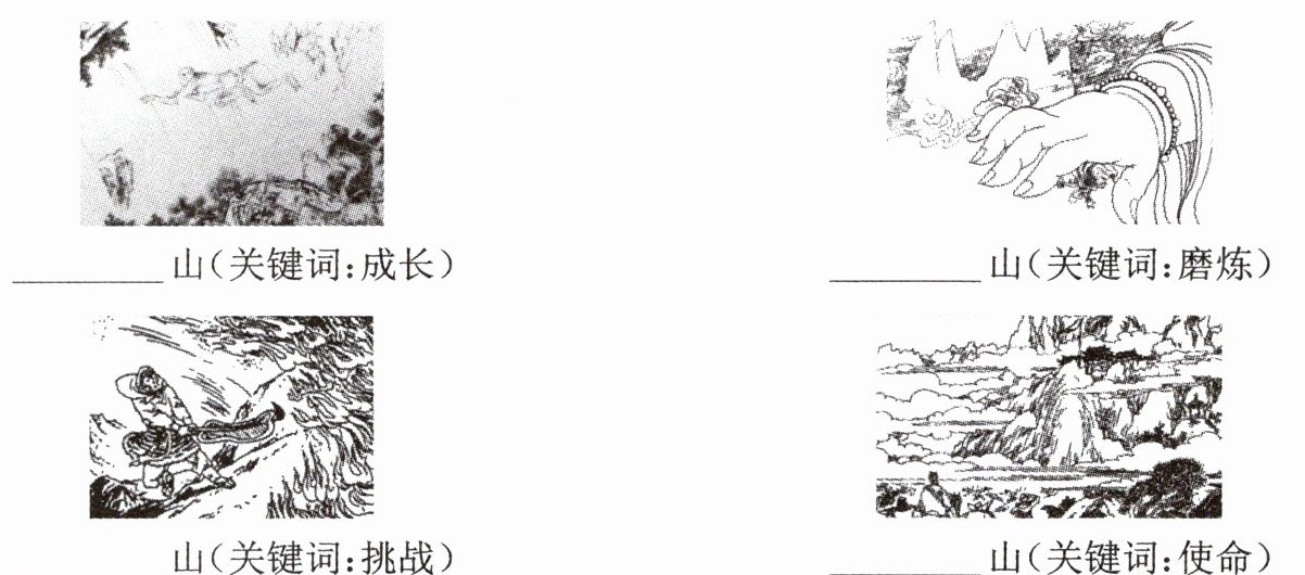 13.回首成长之路,总免不了翻越“高山”。请你写出下面各山的山名,并从中任选一座“山”,联系《西游记》中的相关情节,围绕提示的关键词,说说对你成长的启发。(7分)