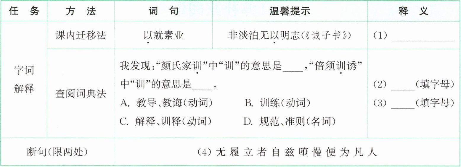 | |查阅词典法|我发现:“颜氏家训”中“训”的意思是____,“倍须训诱”中“训”的意思是____。|A. 教导、教诲(动词)B. 训练(动词)C. 解释、训释(动词)D. 规范、准则(名词)|(2)____(填字母)(3)____(填字母)|