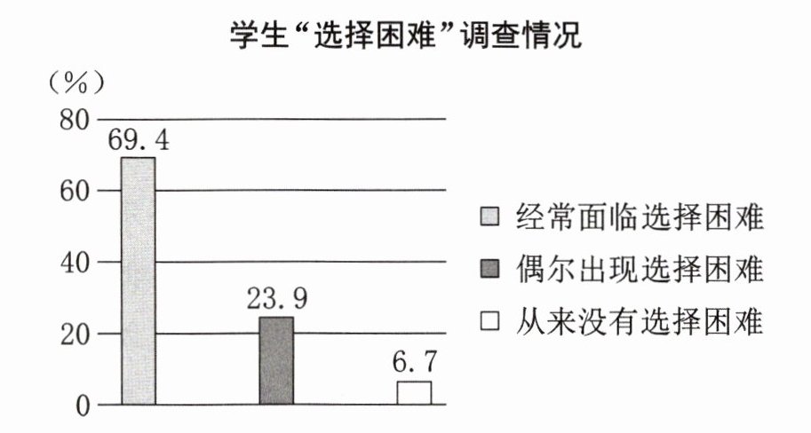 7. 大多数(近七成)同学经常面临选择困难。(2 分) 8. 示例:小丽表姐选择困难背后的心理原因是带有强迫性质地追求完美,给所选事物赋予了太多的意义。(2 分) 9. 示例:同学们,选择困难虽然是一个很普遍的现象,但是它存在危害。(1 分)比如我们经常因为选择困难而浪费时间,同时我们还会有其他的心理亚健康状况,比如不了解自己,内心很容易产生冲突,最后会因为把握不了内心的真正需求而难受不已。(1 分)当然,我们是有办法解决选择困难的。我们可以用列表的方式,把几种选择的好处列出来,选出最重要的;当面临的选择旗鼓相当时,相信自己的第一直觉;我们可以放弃对最优解的执着,从而达到快速做出选择的目的。(2 分)