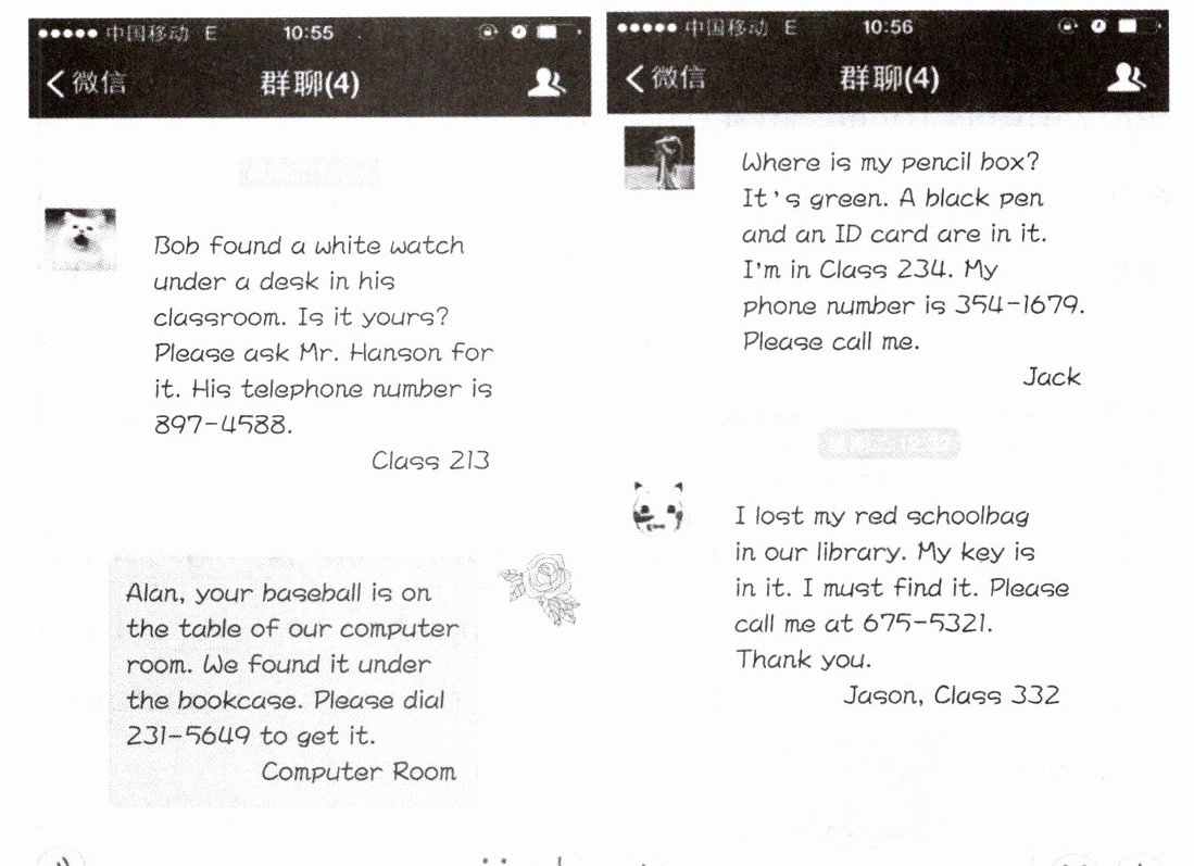2. B 细节理解题。根据左边的第二则信息中“Alan,your baseball is on the table of our computer room.”可知,Alan丢了棒球;根据右边的第一则信息中“Where is my pencil box?”可知,Jack丢了铅笔盒;根据右边的第二则信息中“I lost my red schoolbag in our library.”可知,Jason丢了书包。