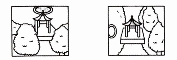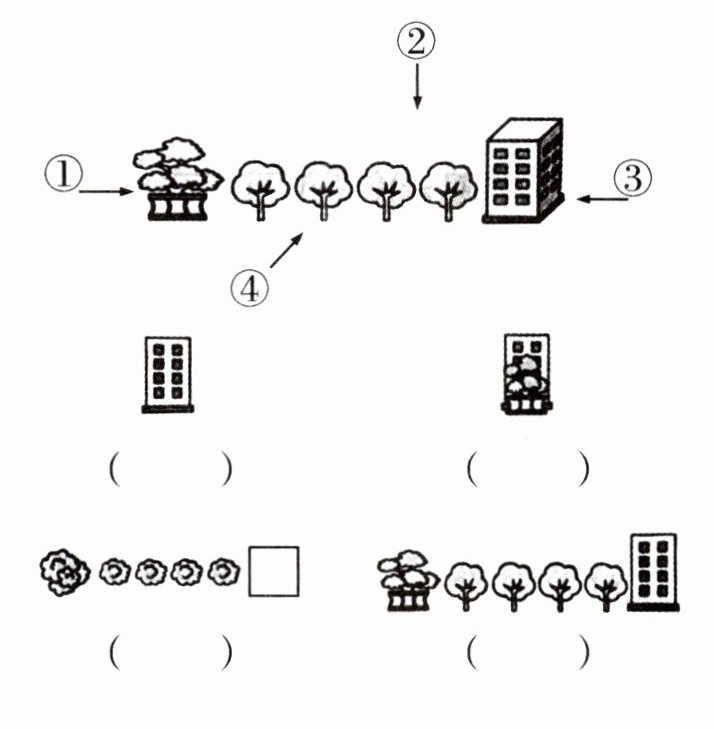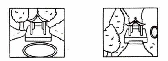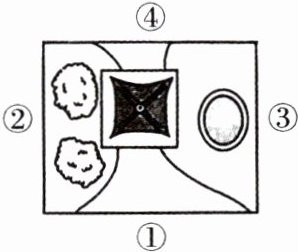 3. 下图是从空中看到的景观,中间有一个亭子,亭子旁边有两棵大树,一个游泳池,一条小路。下面四幅图,分别在①②③④哪个位置看到的?