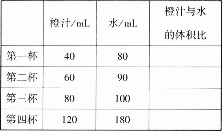 | | 橙汁/mL | 水/mL | 橙汁与水的体积比 |