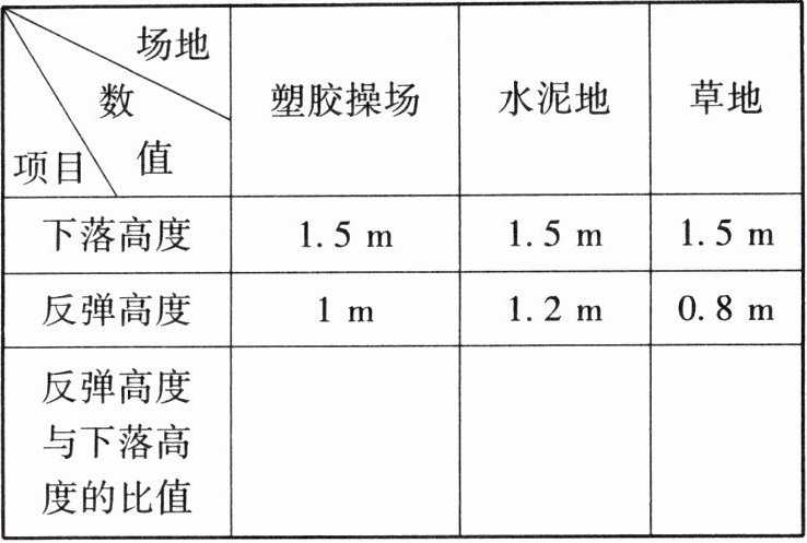 (1) 比较三种场地上篮球反弹高度与下落高度的比值。
