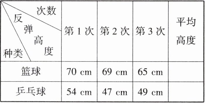 2. 笑笑用篮球和乒乓球做反弹高度的实验。她将两种球置于 100 cm 的高度,自由落下,记录了三次反弹的高度。请你完成表格,并回答问题。