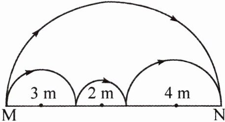 两条路线一样近。理由:$3.14×(3+2+4)÷2=14.13(m)$ $3.14×3÷2+3.14×2÷2+3.14×4÷2=14.13(m)$ 所以两条路线一样近。