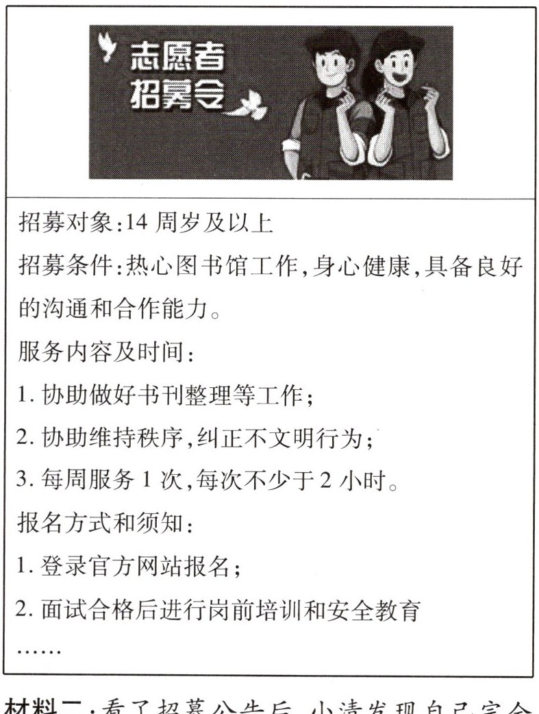 材料二:看了招募公告后,小清发现自己完全符合要求,于是和妈妈商量。