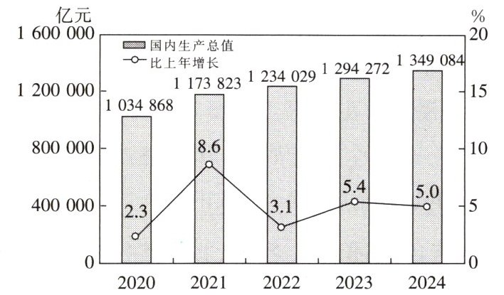 (2)①国家利益是人民利益的集中体现,国家利益与人民利益是高度统一的。国内生产总值增长代表国家经济发展、国家利益巩固,国家有更多资源用于保障民生,推动居民人均可支配收入增长,体现国家利益为人民利益提供保障。②国家利益只有反映人民利益,依靠人民艰苦奋斗,才能得到真正的实现。居民收入增加也会激发消费、促进经济循环,反作用于国家经济发展,维护国家利益,实现二者良性互动。