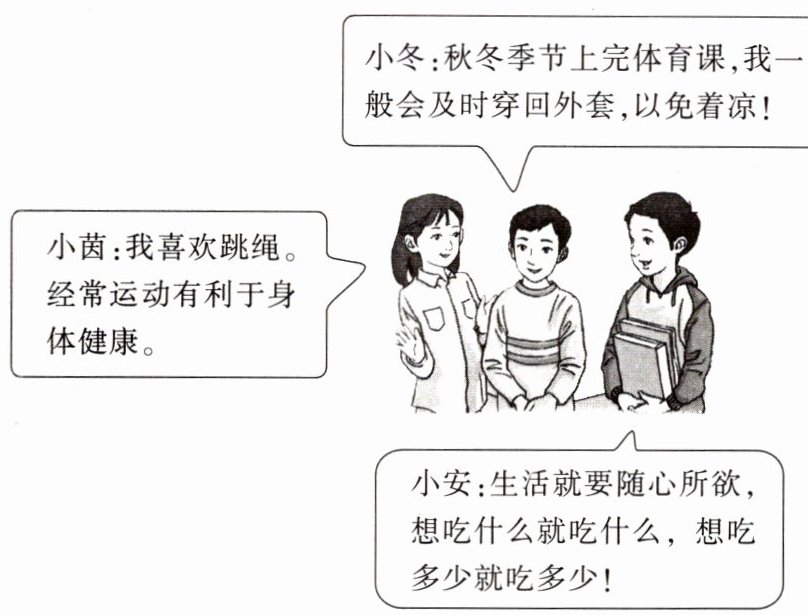 (2)做得好的地方:小茵能够积极、主动、科学地锻炼身体,强健体魄。这样做有利于提高身体的免疫力。小冬有良好的生活方式,这样做有利于预防并减少疾病的发生。做得不好的地方:小安认为“想吃什么就吃什么,想吃多少就吃多少”是错误的。我们要自觉自律,注重饮食有节。