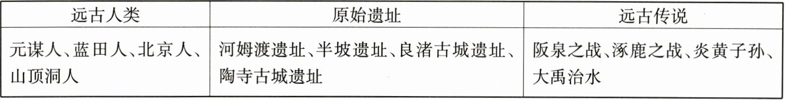 |元谋人、蓝田人、北京人、山顶洞人|河姆渡遗址、半坡遗址、良渚古城遗址、陶寺古城遗址|阪泉之战、涿鹿之战、炎黄子孙、大禹治水|