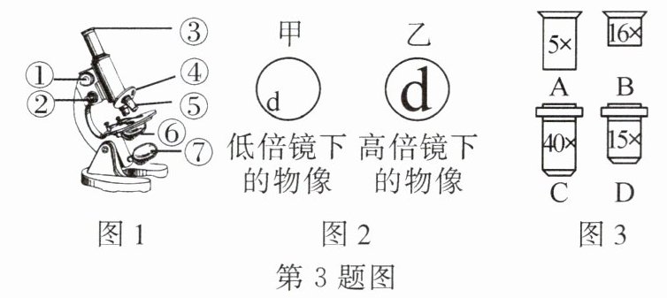 (1)对光时,选图3中的物镜______(填字母),转动图1中的______(填序号)使物镜正对通光孔。