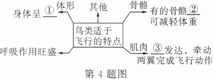 4.如下是某同学构建的鸟类适于飞行的特点的概念图,请据图回答下列问题。