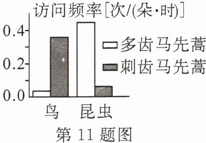 11. 多齿马先蒿的花冠呈“鸟头”状,多个花的集合与鸟群相似,而刺齿马先蒿不具有该形态特征。科研人员研究昆虫和鸟类对马先蒿的访问频率,结果如图所示。科研人员推测出现上述结果是“鸟头”拟态可能规避鸟类,降低昆虫传粉者被捕食的风险,从而提高传粉效率。为验证上述推测,有人设计了如下实验方案: