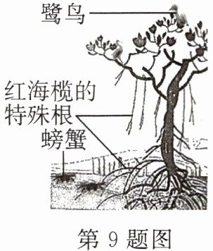 海边海浪冲击力大,泥土松软且缺乏空气,但位于海边的红树林“居民”自有应对妙招。如红海榄(如图)会从枝干上长出特殊的根,根的表层有帮助气体交换的孔隙,根中也贯穿着很多空隙,可以保留空气。每逢海水退走后,螃蟹才出洞,捡食落在泥地上尚未腐烂的落叶、残花和果实;在树顶筑巢的鹭鸟也会飞下来,迈开长腿涉水,用长嘴捕捉小型动物,吓得螃蟹四散奔逃。