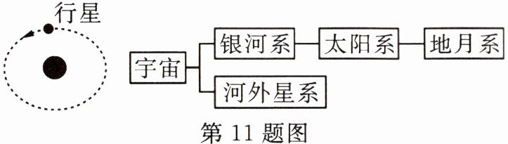 11. 科学家研究发现,太阳系附近有 3 颗可能存在外星生命的行星。如图为其中一颗行星与其绕转的恒星所组成的星系,该星系相当于宇宙结构层次中的 …………………( )
