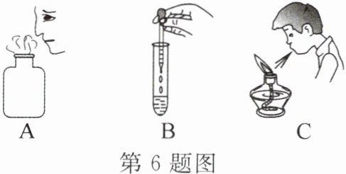 A.直接用鼻子闻药品的气味 B.胶头滴管伸人试管内C.用嘴吹灭酒精灯