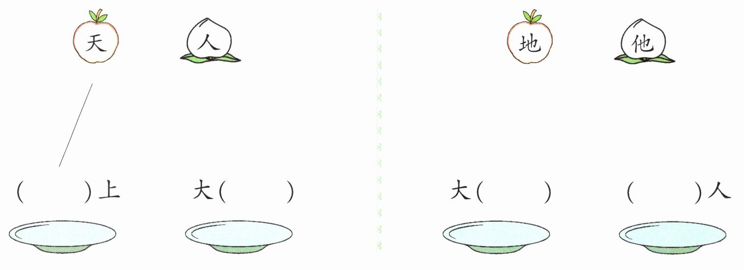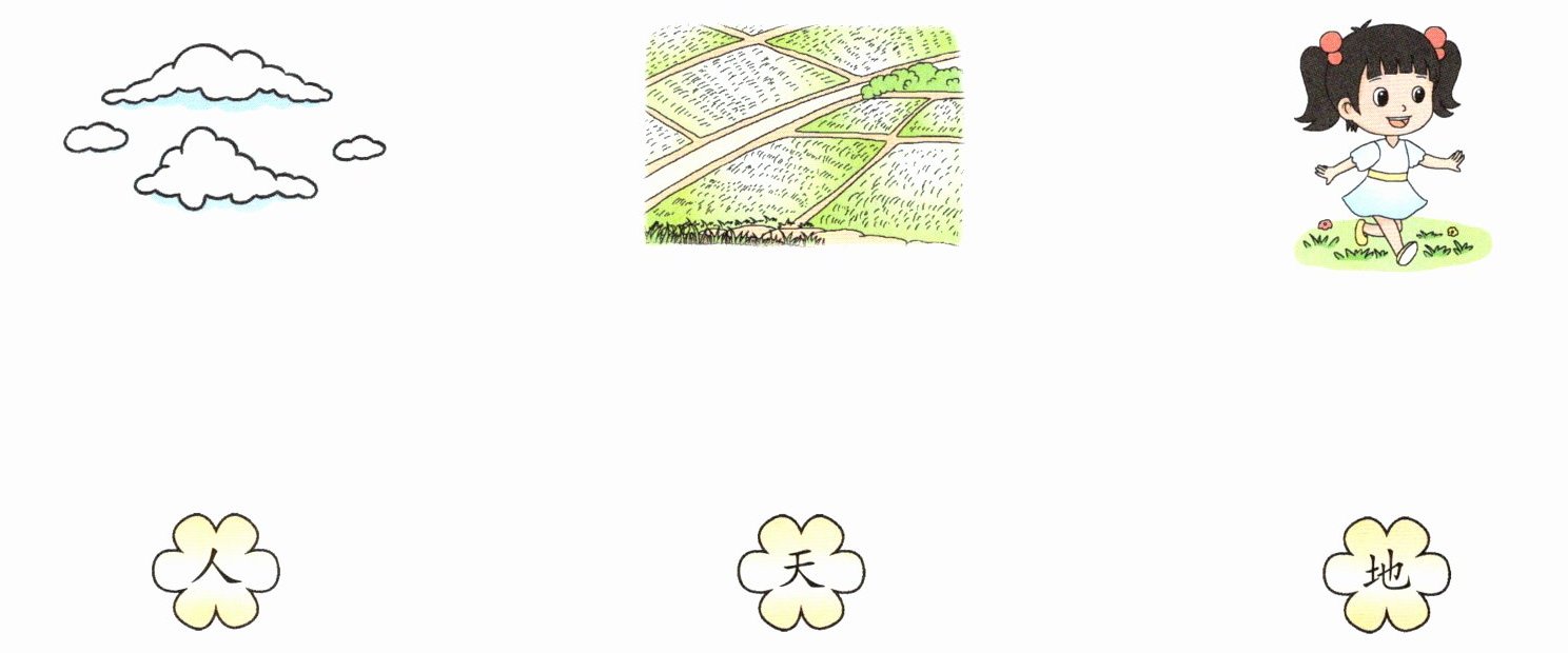 第一幅图连“天”,第二幅图连“地”,第三幅图连“人”。