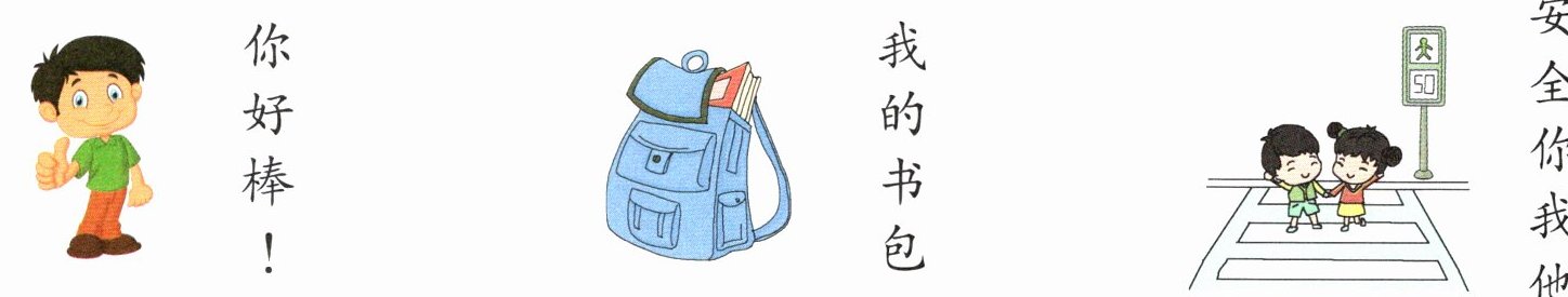 在“你好棒!”中“你”用“○”圈出来;在“我的书包”中“我”用“○”圈出来;在“安全你我他”中“你”“他”分别用“○”圈出来(因无法实际画圈,文字表述圈的位置)。