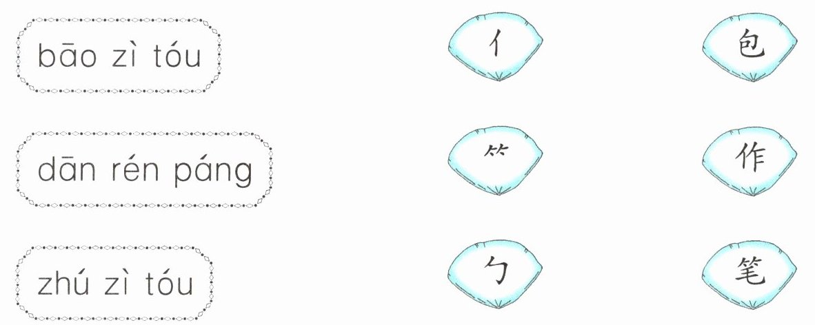 bāo zì tóu——勹——包 dān rén páng——亻——作 zhú zì tóu——竹——笔
