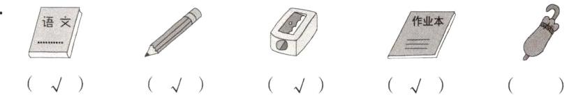 2. 儿歌中,小书包里有哪些宝贝?在括号里画“√”。