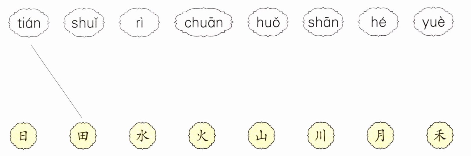 tián-田,shuǐ-水,rì-日,chuān-川,huǒ-火,shān-山,hé-禾,yuè-月