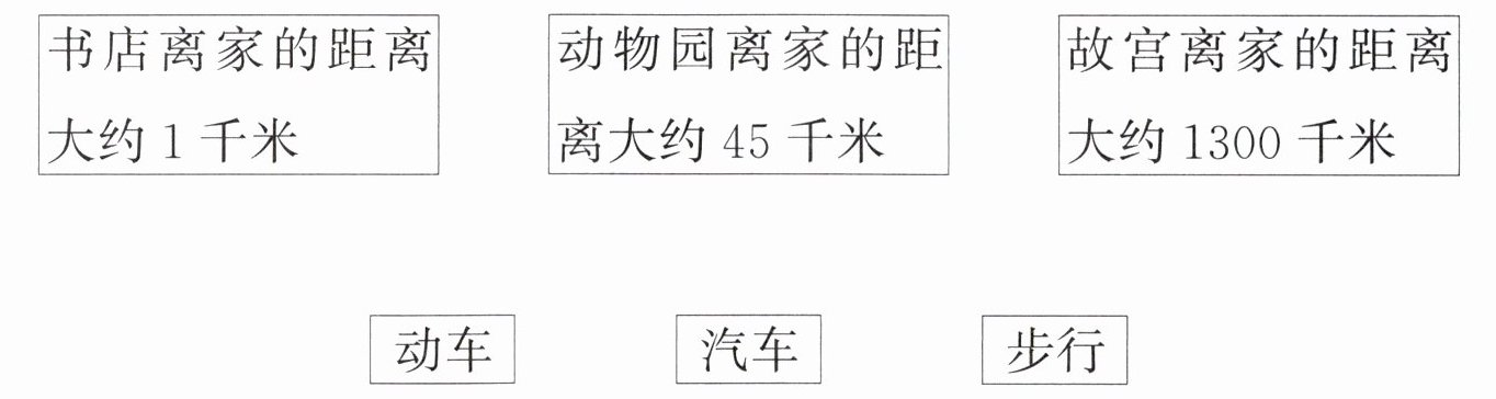答案:书店——步行;动物园——汽车;故宫——动车。