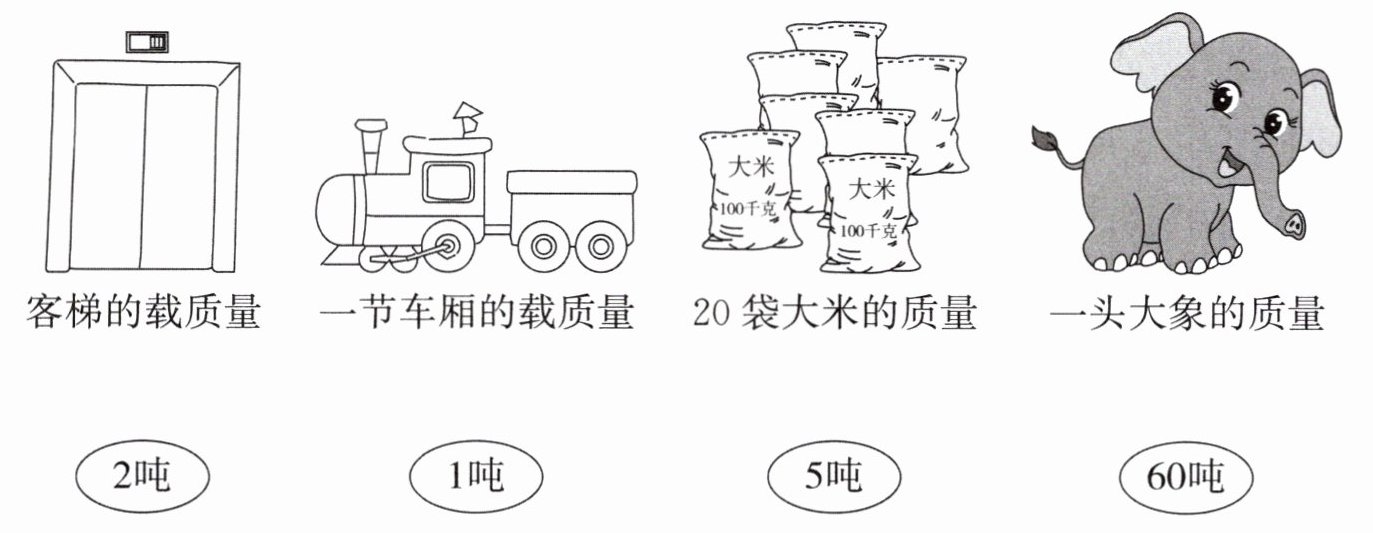 综上,连线结果为:客梯的载质量——1吨;一节车厢的载质量——60吨;20袋大米的质量——2吨;一头大象的质量——5吨。