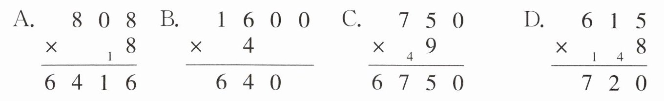 B选项:三位数的中间有0,并不意味着积的中间一定也有0。例如,105×3=315,积的中间没有0,所以B选项错误。