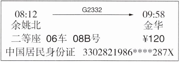 1. 三年级的欢欢、弟弟和爸爸、妈妈从余姚北站乘高铁去金华游玩,如图是其中一人的乘车信息,这是四人中