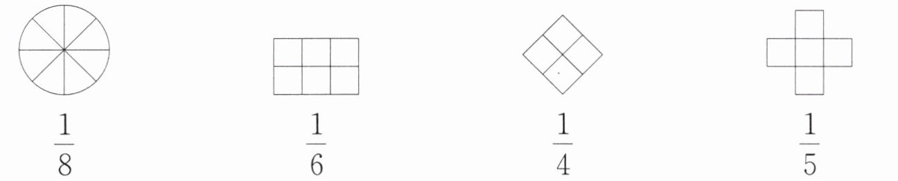 第四个图形被平均分成了$5$份,$\frac{1}{5}$表示把一个整体平均分成$5$份,取其中的$1$份,故给其中$1$份涂色。(涂法不唯一)