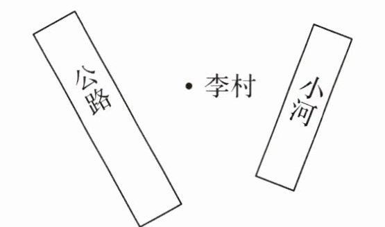 4. 李村要修一条到公路的小路,还要修一条从小河到李村的水渠,请你帮李村设计一下,怎么修路、建渠路线最短?在图上画一画。
