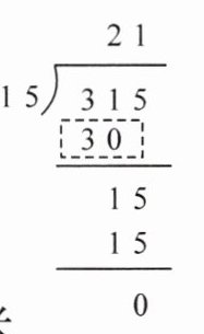 )。$\begin{array}{r} 21\\ 15\enclose{longdiv} {315}\\ \boxed{300}\\ \hline 15\\ 15\\ \hline 0\end{array} $